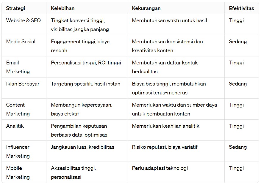 Dalam dunia digital marketing yang terus berkembang, UMKM dihadapkan pada berbagai strategi untuk meningkatkan visibilitas dan penjualan mereka. Dari SEO hingga influencer marketing, setiap strategi memiliki kekuatan dan keterbatasannya sendiri. Memahami cara kerja dan efektivitas relatif dari masing-masing strategi penting untuk menentukan mana yang paling cocok dengan kebutuhan spesifik bisnis Anda. Berikut ini adalah analisis komprehensif yang membandingkan tren-tren utama dalam digital marketing untuk UMKM, bertujuan untuk mengidentifikasi strategi yang paling powerful.