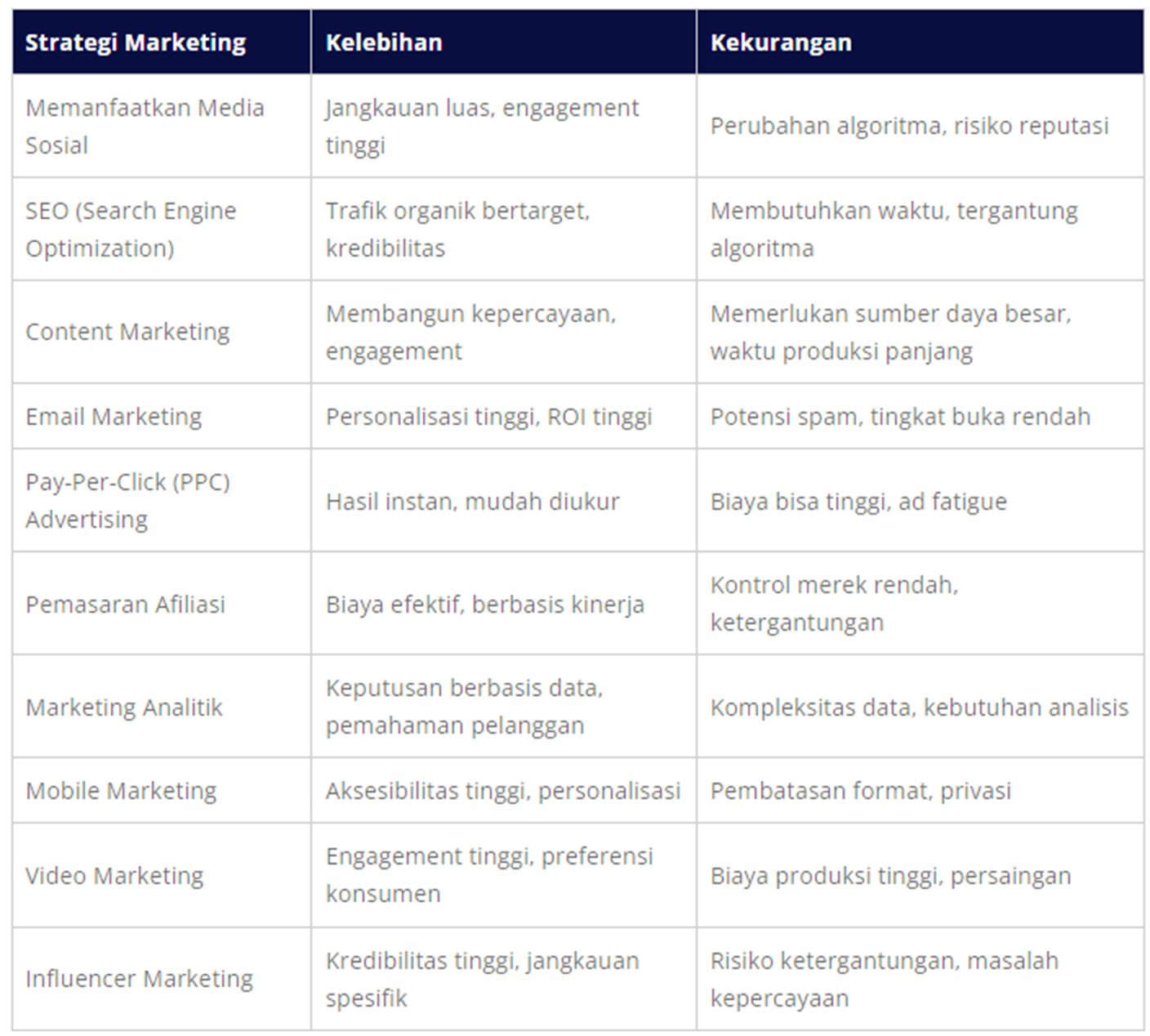Dalam memilih strategi digital marketing yang paling efektif, penting untuk mempertimbangkan karakteristik unik dari bisnis Anda serta tujuan pemasaran yang ingin dicapai. Setiap “rahasia” atau strategi digital marketing memiliki kelebihan dan kekurangannya masing-masing, yang berkontribusi pada kesuksesan keseluruhan dalam konteks yang berbeda.
