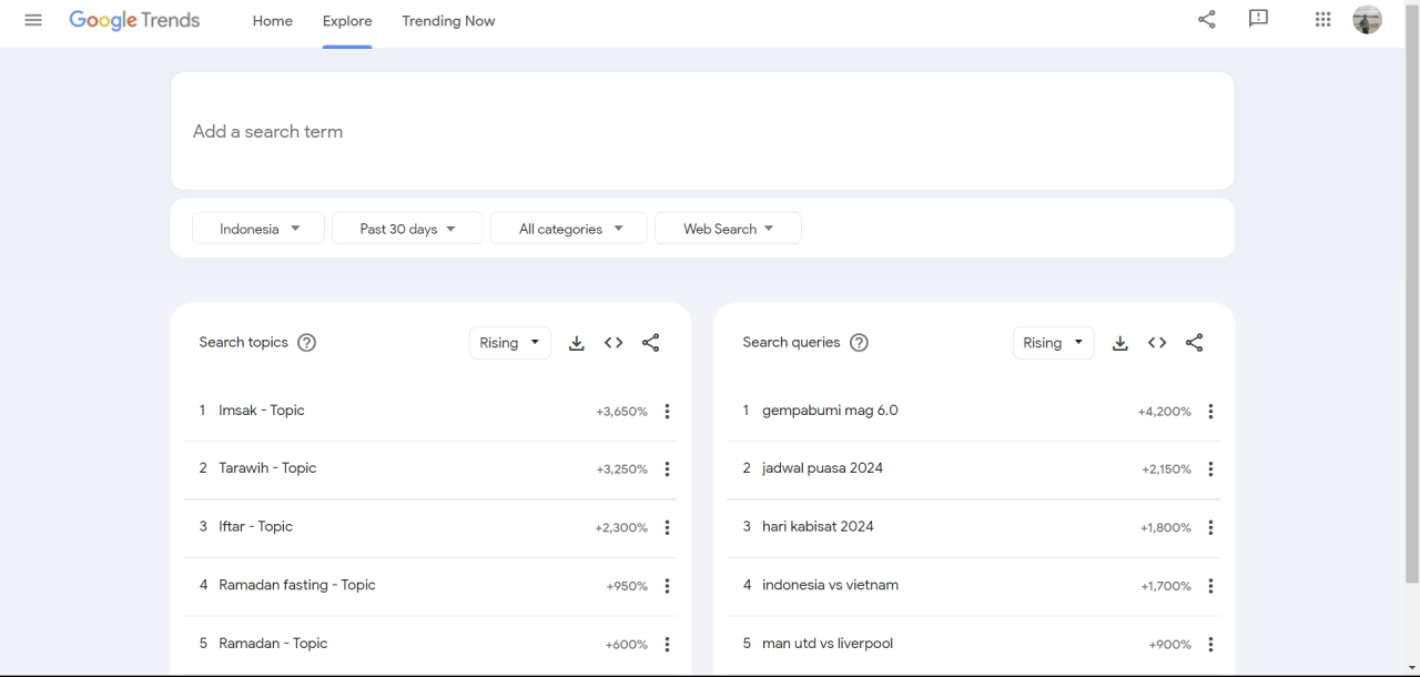 Penggunaannya sangat sederhana: cukup masukkan kata kunci yang Anda minati, dan Google Trends akan menampilkan grafik yang menggambarkan volume pencarian kata kunci tersebut seiring waktu. Anda juga dapat membandingkan beberapa kata kunci untuk melihat mana yang lebih populer atau menemukan data berdasarkan wilayah geografis, memberikan insight berharga tentang di mana audiens target Anda lebih aktif mencari topik tertentu.