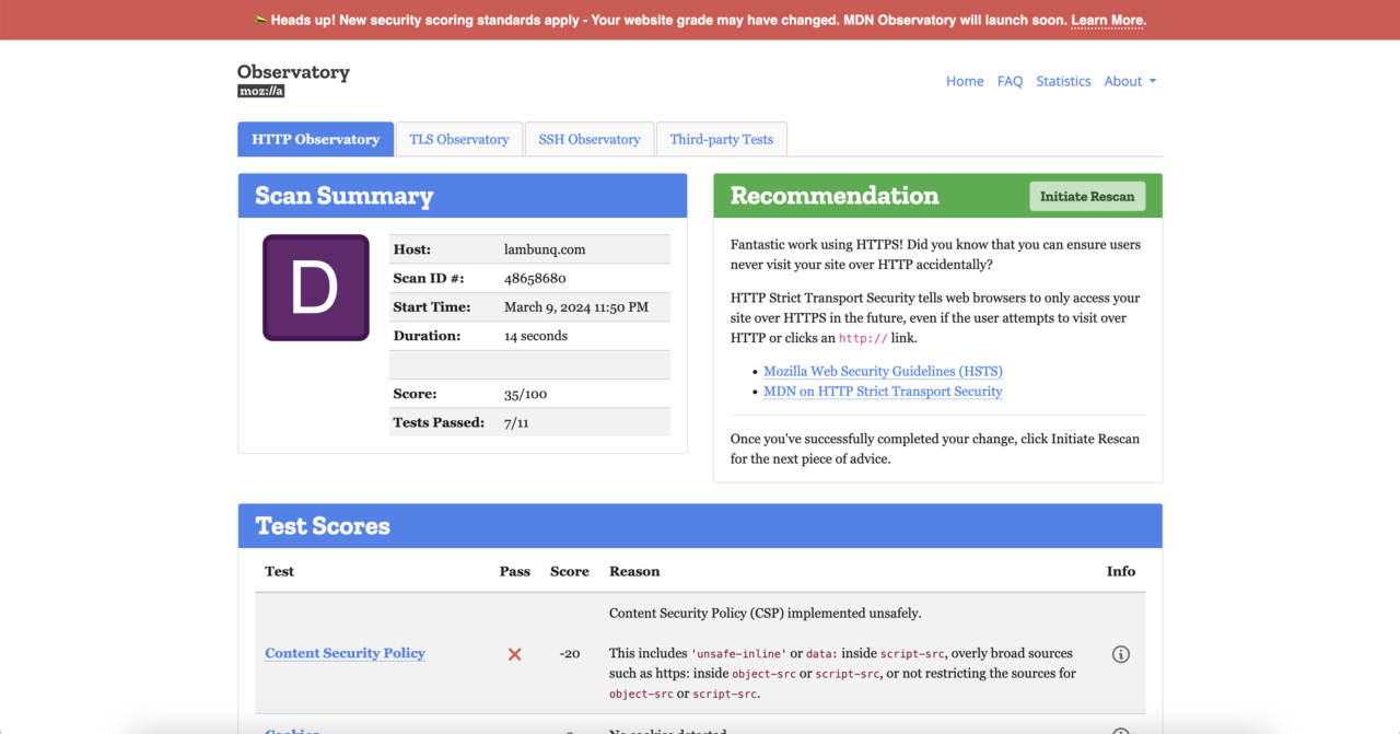 Mozilla Observatory melakukan scan mendalam pada website untuk mengevaluasi berbagai aspek keamanan, termasuk penggunaan HTTPS, kebijakan keamanan konten (CSP), HTTP Strict Transport Security (HSTS), dan banyak lagi.