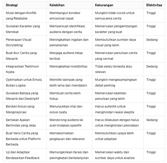 Memahami dan membandingkan strategi storytelling marketing yang telah kita bahas dapat membantu dalam menentukan pendekatan yang paling efektif untuk merek Anda. Masing-masing strategi memiliki kekuatan dan aplikasinya sendiri, tergantung pada tujuan, audiens target, dan sumber daya yang Anda miliki. Untuk membantu Anda dalam membuat keputusan strategis ini, mari kita tinjau dan bandingkan setiap strategi dalam bentuk tabel yang memudahkan.