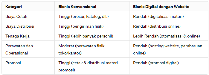 Tabel Perbandingan Biaya Operasional Bisnis Konvensional vs Bisnis Digital dengan Website