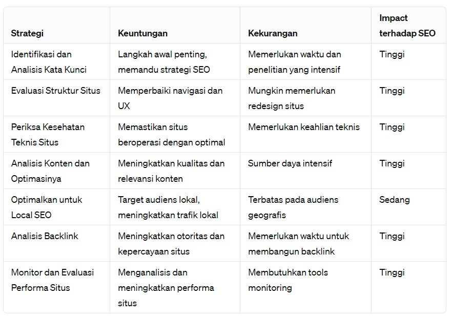 Pemilihan strategi SEO yang paling efektif memerlukan pemahaman mendalam tentang berbagai teknik dan bagaimana mereka saling berinteraksi untuk meningkatkan kinerja situs web Anda. Berikut ini adalah analisis singkat yang membandingkan setiap strategi yang telah dibahas: