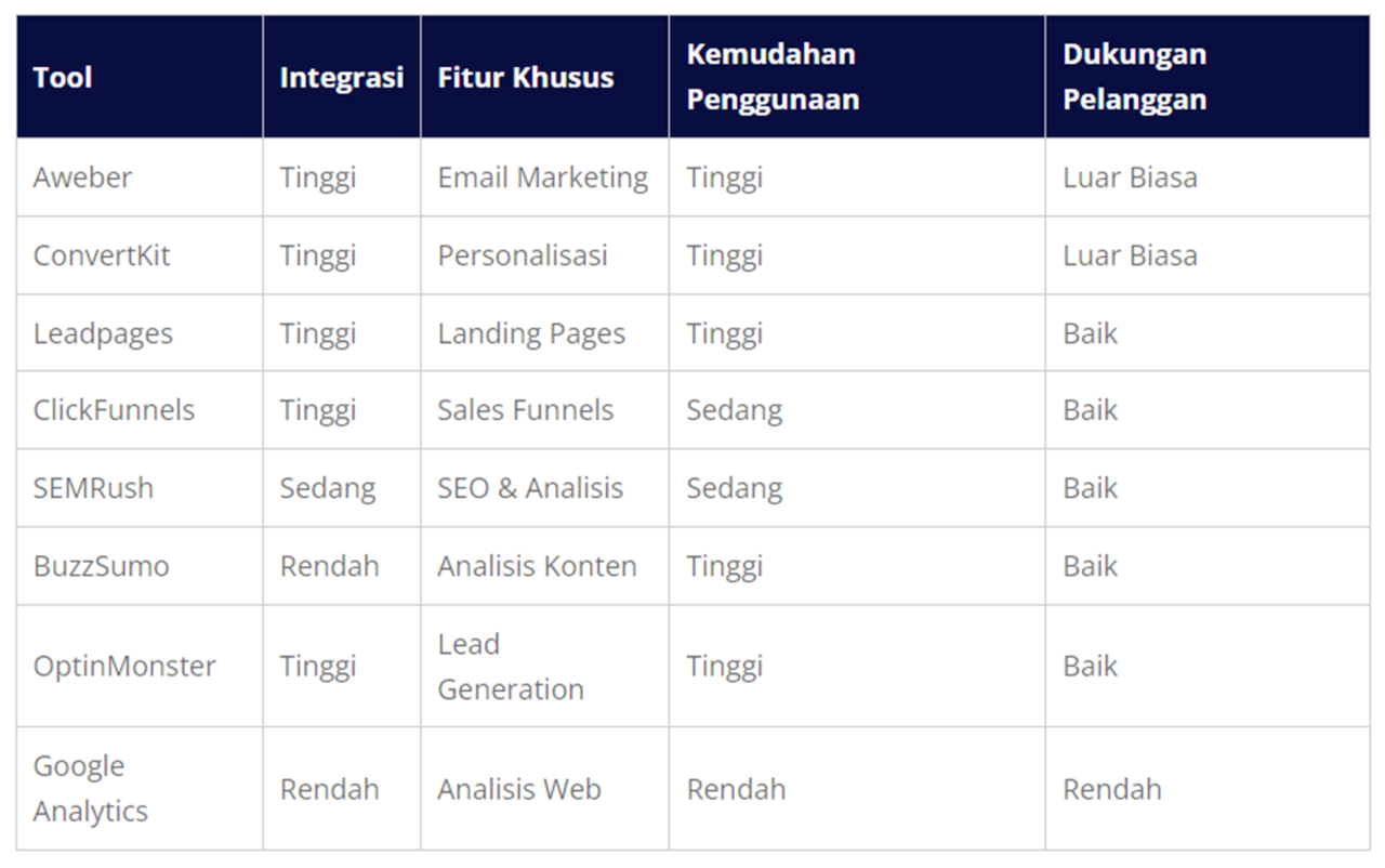 Berdasarkan tabel perbandingan tersebut, bisa dilihat bahwa tiap tool memiliki kekuatan di area tertentu. Namun, jika harus memilih satu yang paling powerful, ClickFunnels muncul sebagai tool yang sangat versatile, mampu tidak hanya membantu dalam pembuatan dan pengelolaan funnels penjualan yang efektif tetapi juga menawarkan integrasi luas dan kemampuan untuk meningkatkan konversi secara signifikan.