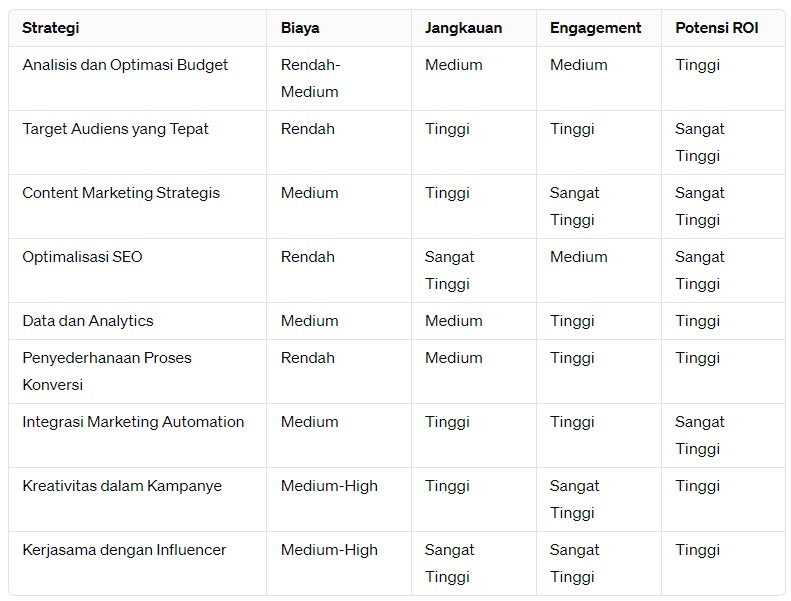 Tabel Perbandingan Strategi Pemasaran untuk Meningkatkan Marketing ROI - WiseWebster.com
