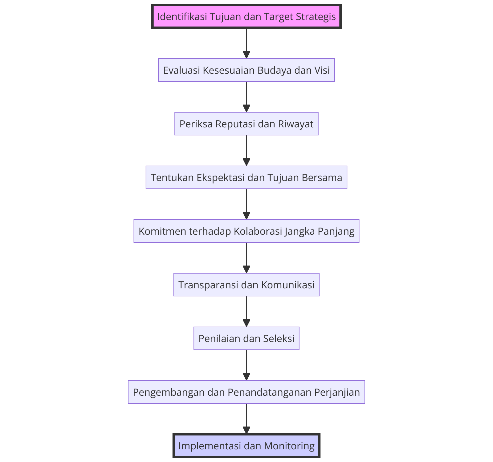 Untuk mencari dan memilih mitra strategis yang tepat, perusahaan B2B harus pertama-tama mengidentifikasi tujuan dan target strategis mereka. Ini bisa berkisar dari memperluas ke pasar baru, meningkatkan penawaran produk, hingga menguatkan posisi kompetitif. Setelah tujuan telah ditetapkan, berikut adalah beberapa tips untuk mencari dan memilih mitra yang sesuai: